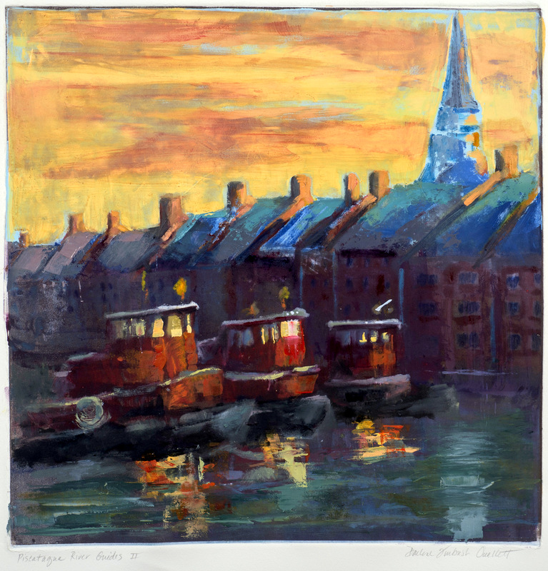 “Piscataqua River Guards I” Tug Boats In Piscataqua River-Setting Sun Behind Historic City Of Portsmouth NH Printmaking Image