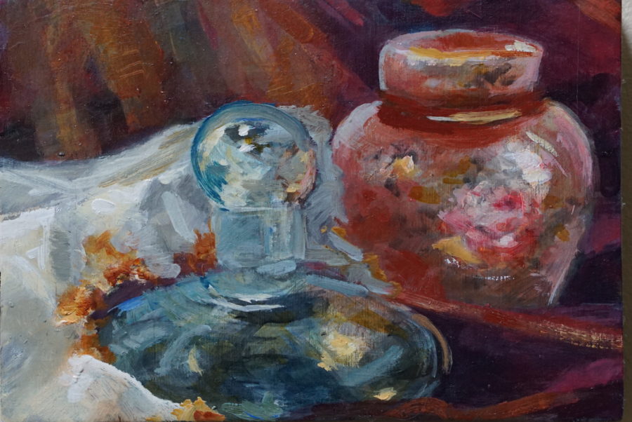 “Memories Of My Mother” Perfume Bottle and Ginger Jar Oil/Board