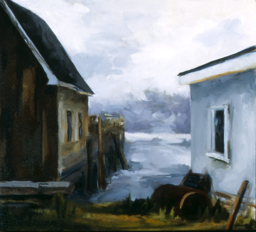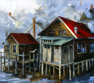 “Sunbeam On The Boathouse”- Vinalhaven ME Oil On 20 x 20 Canvas Box